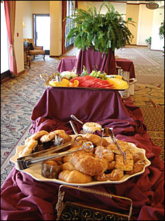 ホテルの中庭に並べられたメニューは、低脂肪のヘルシーなものばかりです。